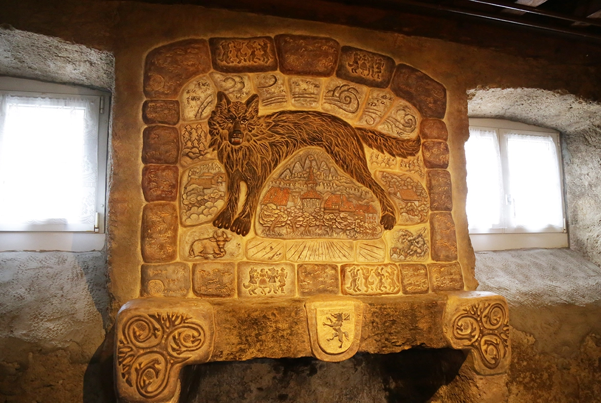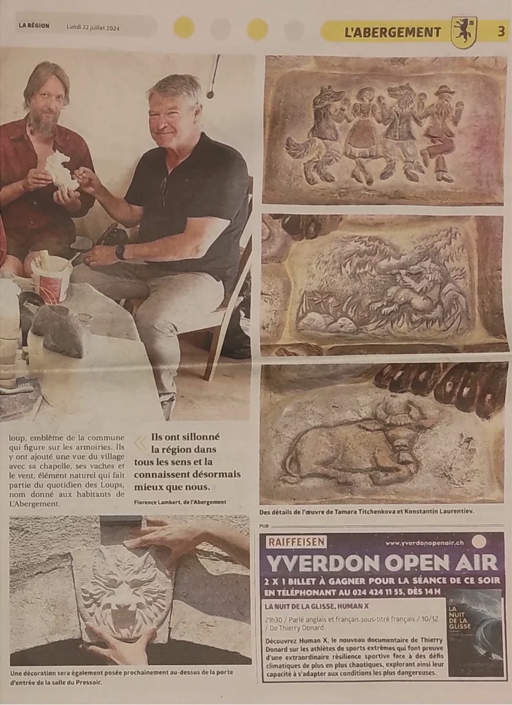 Nos œuvres ornent l’intérieur et l’extérieur de nombreux foyers en Suisse. Parmi elles, le bas-relief monumental au-dessus de la cheminée dans l’espace commun à L’Abergement. Entre autres, des sculptures telles que « Cernunnos » en malas, « Le Gardien de la Balance » en calcaire égyptien, « Loup blanc » en béton, la lampe murale « Likinésis », l’œuvre graphique « Le Chalet et ses habitants invisibles », les lampes-tableaux « Warlock », « Village des Carpates », « Ranger », etc.