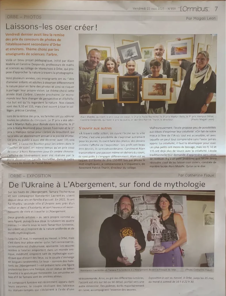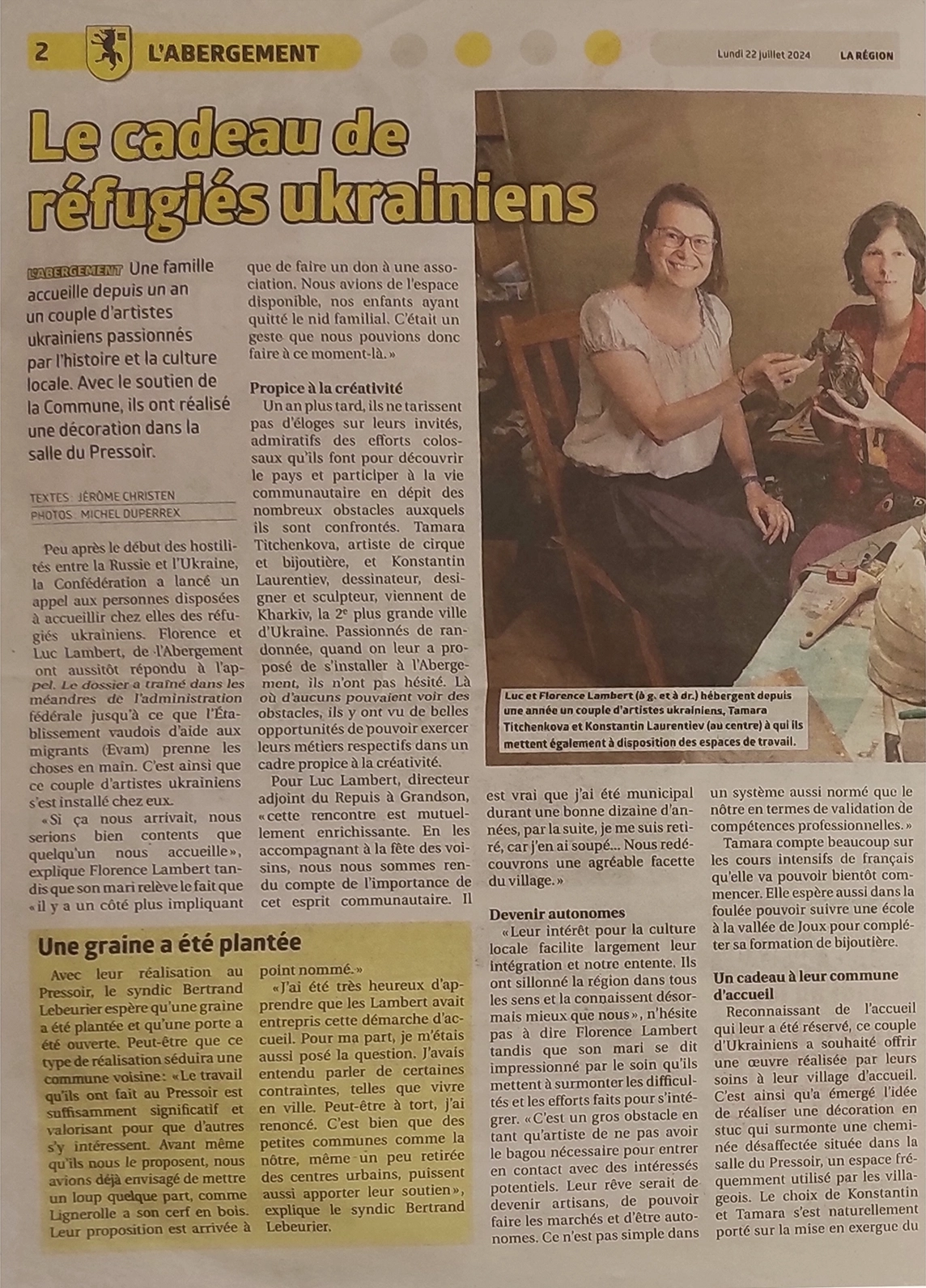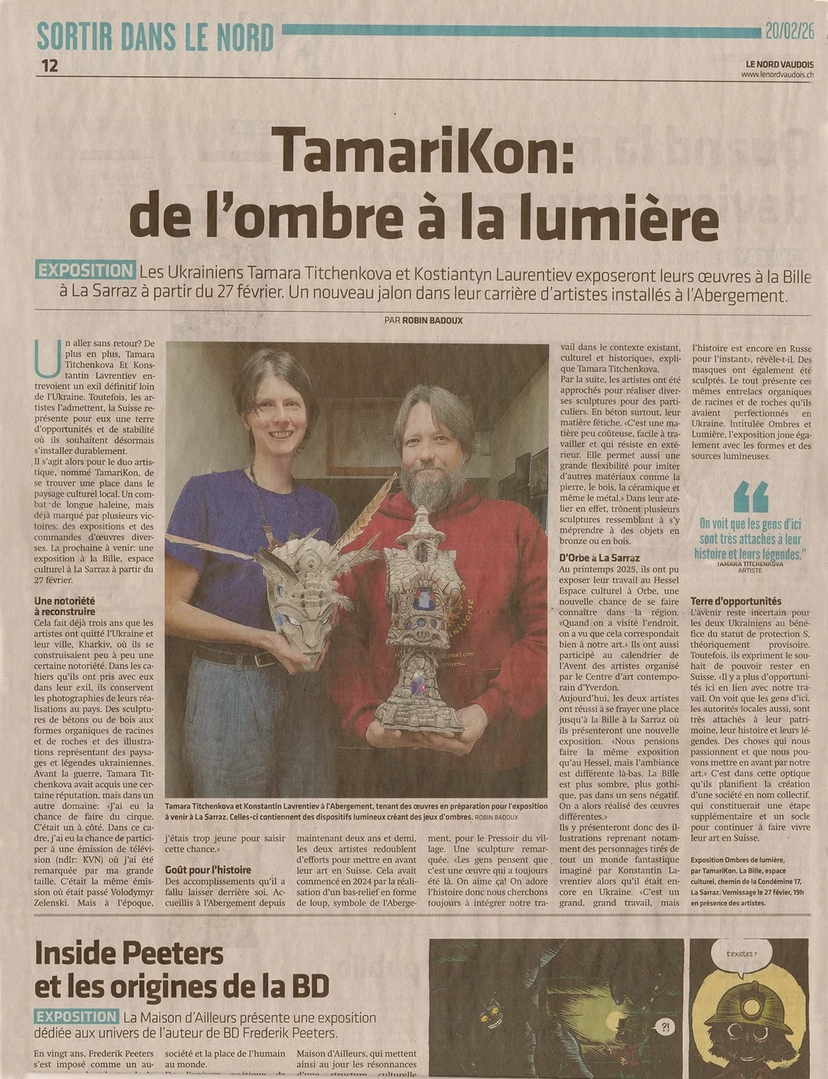 un couple d’artistes ukrainiens, Konstantin Lavrentiev et Tamara Titchenkova. Nous vivons en Suisse depuis 2023 et nous sommes extrêmement reconnaissants de l’aide apportée aux nôtre population. La sculpture et l’art graphique étaient nos métiers en Ukraine, et nous poursuivons ces activités ici.