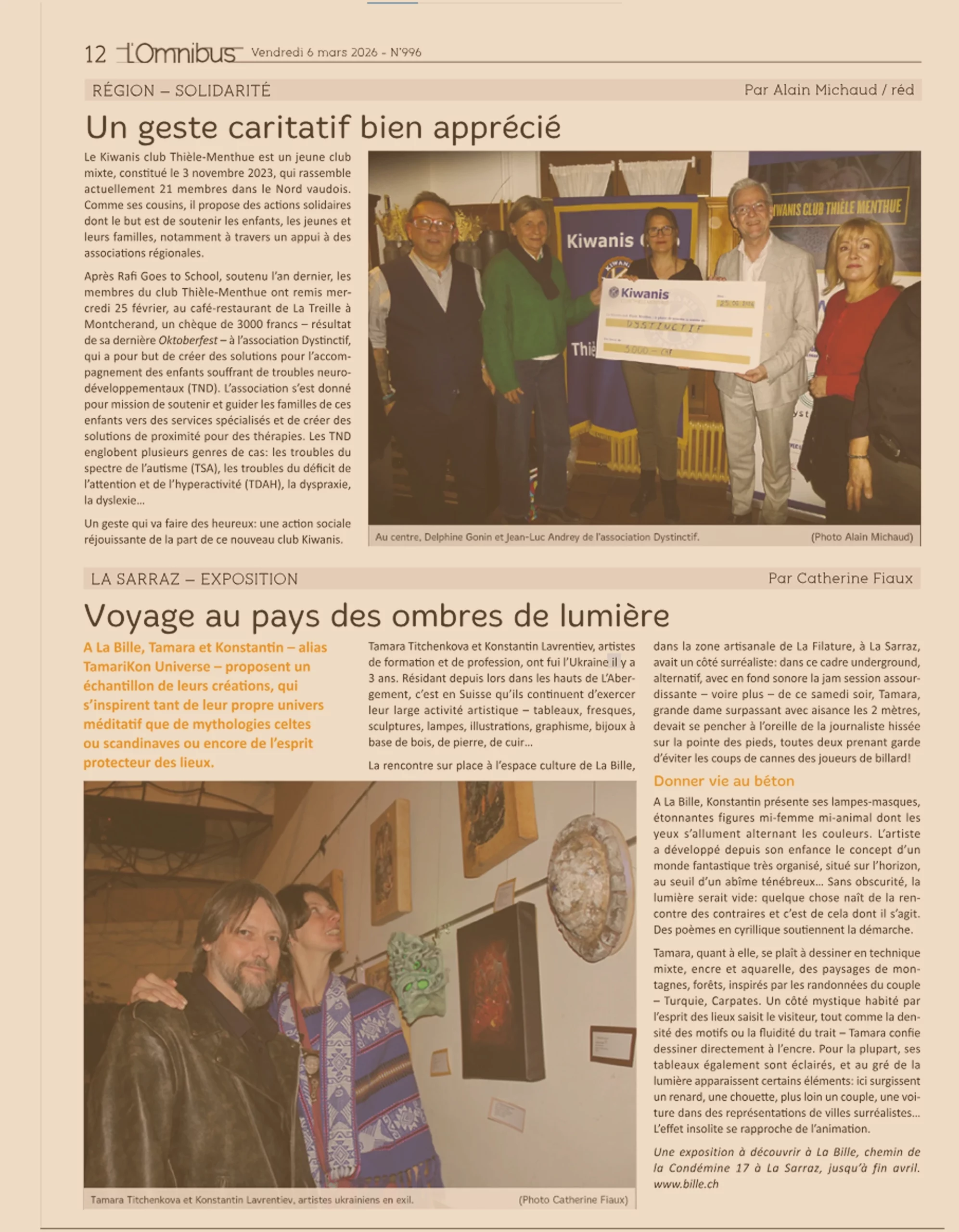 Nous avons également eu l’occasion de présenter nos expositions personnelles à l’espace culturel Hessel Espace Culturel à Orbe, à La Bille – Espace culturel à La Sarraz, ainsi que des expositions collectives à la ferme du château de Bussy-Chardonney, etc.